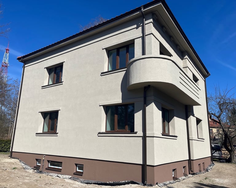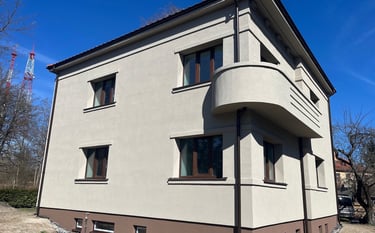 Dviejų aukštų renovuotas namas Kauno žaliakalnyje. Apšiltintas 20cm fasadine vata, apdailintas Nano Silikoniniu tinku. Atkartoti visi autentški fasado apdailos apvadai ir dekoratyvios fasado detalės