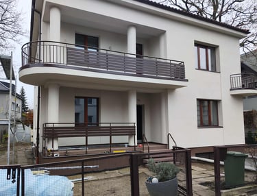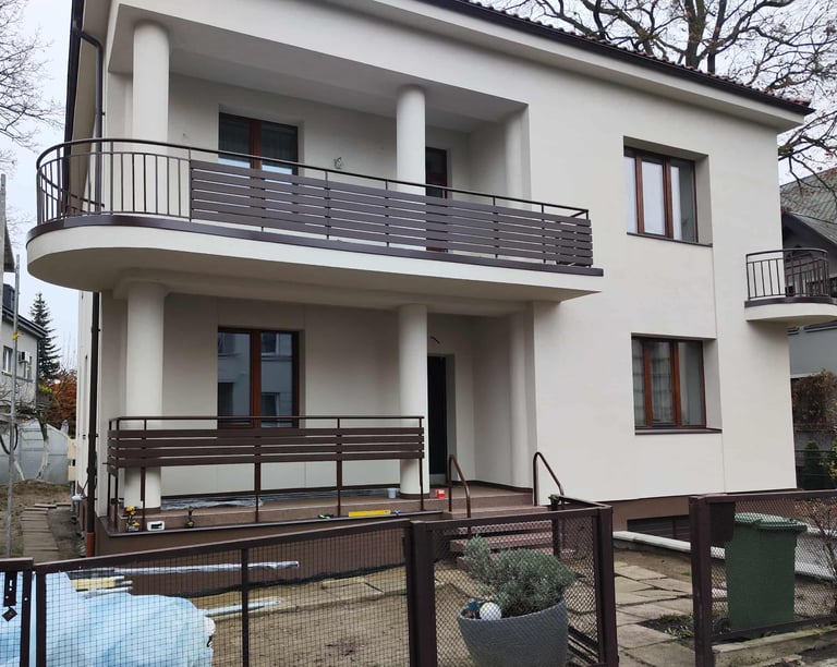 Dviejų aukštų art deco stiliaus namas Kauno žaliakalnyje. Renovuotas šiltinant 15cm EPS70 neoporu. Sienos apdailintos Nano Silikonu, pamatas dekoratyvine mozaika, terasos ir laiptai atnaujinti akmens kilimu.