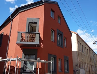 Trijų aukštų renovuotas namas Kauno senamiestyje. Apdailintas Nano Silikoniniu dekoratyviniu tinku. Atkartotos istoriškos apdailos detalės su šiuolaikiškomis architektūrininėmis namo apdailomis.